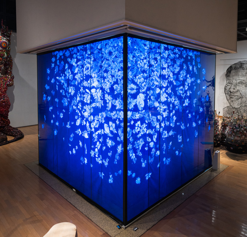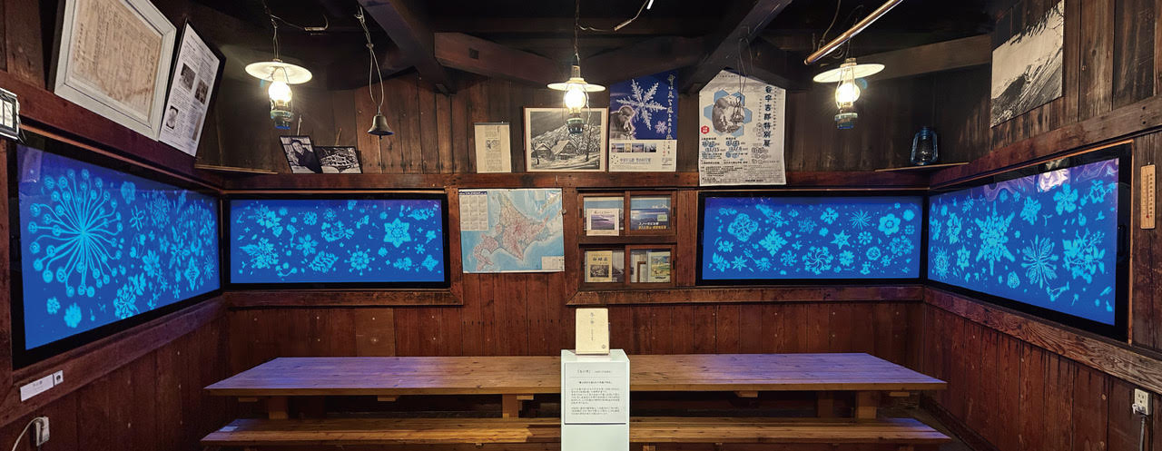 本作品は、福島第一原子力発電所の建屋をモチーフに、東日本大震災後の時間と記憶を植物やカーボン紙で表現したものです。大学時代を東北で過ごした齋藤氏が2020年に福島県双葉町を訪れたことを契機に制作が開始されました。作品の裏面からのLED照射により、植物の造形が淡く浮かび上がる構成が特徴です。
