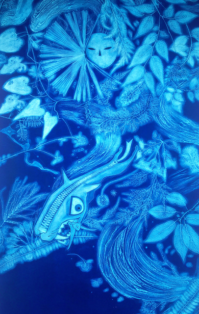 作品の印象を大きく左右する“青”の色調。齋藤氏からは「さまざまな素材を試したが、この“青”を発色できるのはゼネラル社のものだけだった」とのお言葉をいただいております。実は当社にとっても、ゼネラルの青色カーボン紙がこのような美しい“青”の表現に活かされることは新たな発見でした。この独特の青色が齋藤氏の繊細な表現と組み合わさることで、作品の印象を形づくる重要な要素となっています。