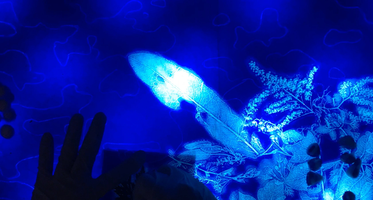 「まず、カーボン紙のブルーの色に目を奪われる。一見遠くから見るとデザイン的なイメージかと思い、近づいてみるとその儚さと繊細さに衝撃を受ける。裏からの強いLEDライトもカタチを崩した植物のラインを強調している。ベースフォルムを福島第一原子力発電所建屋から成っている点、収集された植物が帰宅困難地で被曝しただろう植物という点に心打たれた。」
