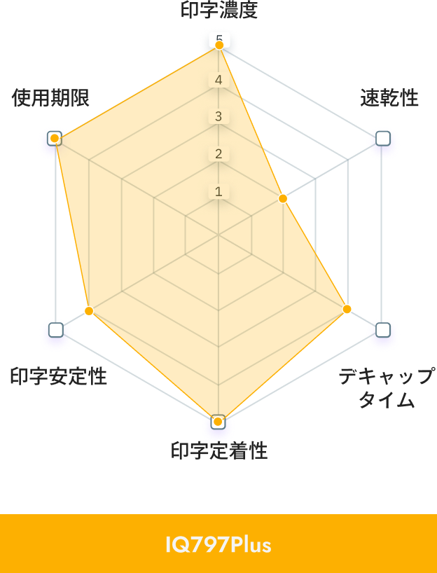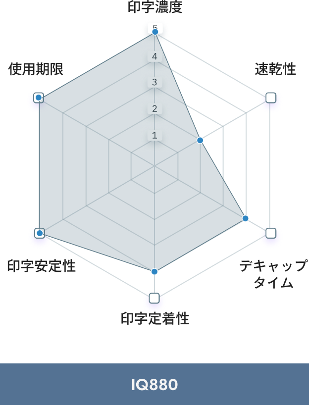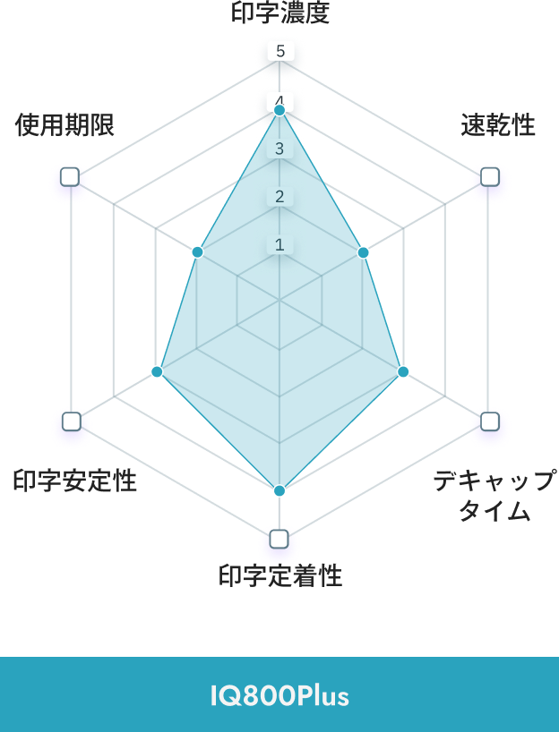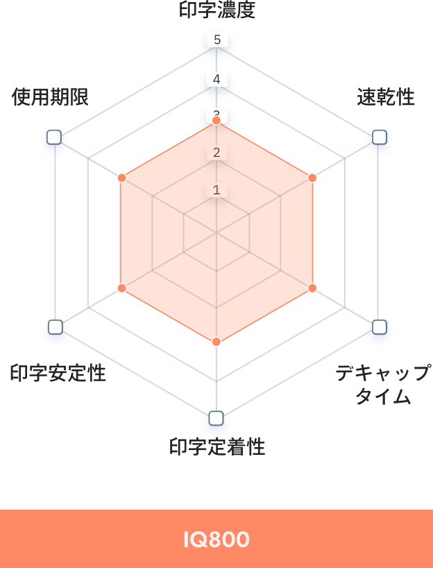 私たちは様々なニーズに応えるべく日々研究開発を重ね、製品の充実化を図ってきました。中でも「溶剤系黒インク」のバリエーションには自信があり、あらゆる使用条件で高いパフォーマンスを発揮する高汎用インクから突出した性能を持つ特化型インクまで、幅広いラインナップを誇ります。下図は、その「溶剤系黒インク」を代表する製品の性能を可視化したものです。ご要望にマッチするインクと出会うためのツールとして是非お役立てください。溶剤系黒インク以外でも気になるインクがございましたら、お気軽にお問合せください。基材や用途、使用条件等に合った最適なソリューションを提案いたします。※自社製品IQ800の性能を基準として採点しています。TIJ製品の比較を目的とした社内評価に基づくデータであり、性能を保証するものではありません。